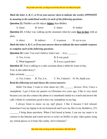 Question 25. Tom is talking to a sales assistant about a tablet he wants to buy. Tom: Is this tablet heavy? Sales assistant: _______. A. Yes, it does. B. Yes, it is.