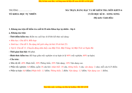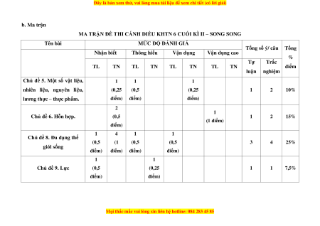 MA TRẬN ĐỀ THI CÁNH DIỀU KHTN 6 CUỐI KÌ II – SONG SONG Tên bài