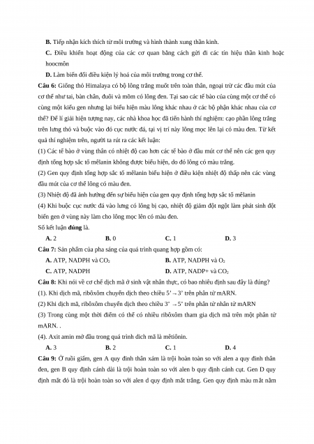 Câu 6: Giống thỏ Himalaya có bộ lông trắng muốt trên toàn thân, ngoại trừ các đầu mút của