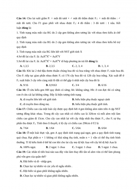 Câu 14: Cho lai ruồi giấm P: ♀ mắt đỏ tươi × ♂ mắt đỏ thẫm được F1: ♀ mắt đỏ thẫm : ♂