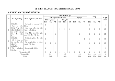 ĐỀ KIỂM TRA CUỐI HỌC KÌ II MÔN ĐỊA LÍ LỚP 8