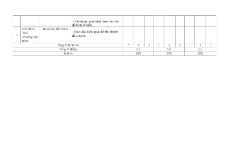 - Ba nhóm đất chính. - Biết: đặc điểm phân bố ba nhóm 3 Thổ nhưỡng Việt đất chính 1 Nam. Tổng số lệnh hỏi 7 1 2 1 1 2 0 2 1 Tổng số điểm 2,5 1,0 1,5 Tỷ lệ % 50% 20% 30%