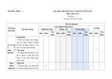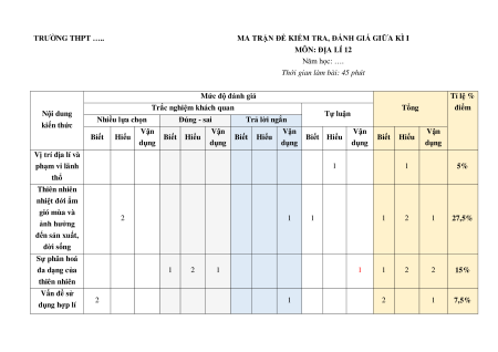 MA TRẬN ĐỀ KIỂM TRA, ĐÁNH GIÁ GIỮA KÌ I MÔN: ĐỊA LÍ 12 Năm học: ….