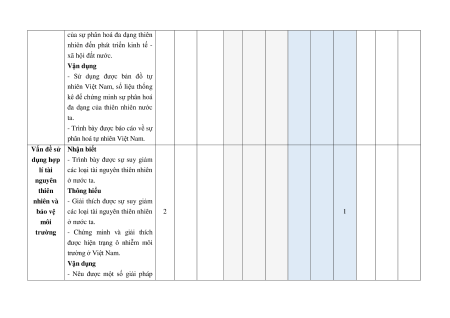 Vị trí địa lí và phạm vi lãnh 1 1 5% thổ Thiên nhiên nhiệt đới ẩm gió mùa và 2 1 1 1 2 1 27,5% ảnh hưởng đến sản xuất, đời sống Sự phân hoá đa dạng của 1 2 1 1 1 2 2 15% thiên nhiên Vấn đề sử 2 1 2 1 7,5% dụng hợp lí tài nguyên thiên nhiên và bảo vệ môi trường Dân số 1 2 1 1 2 1 10% Lao động và 1 2 4 1 2 4 17,5% việc làm Đô thị hóa 3 2 2 3 2 2 17,5% Đô thị hoá 6 6 2 4 2 8 1 1 1 9 11 11 31 Tổng số điểm 3,0 2,0 2,0 3,0 4 3 3 10 40 100% Tỉ lệ % 30% 20% 20% 30% 30% 30% % TRƯỜNG THPT …..