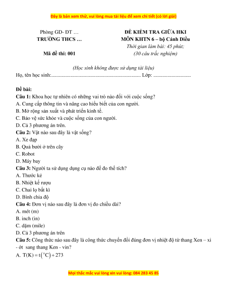 - Tailieugiaovien.com.vn giới thiệu bộ 9 đề thi giữa kì 1 môn Khoa học tự nhiên 6 Cánh diều mới nhất năm 2023 nhằm giúp Giáo viên có thêm tài liệu tham khảo ra đề thi Khoa học tự nhiên lớp 6.