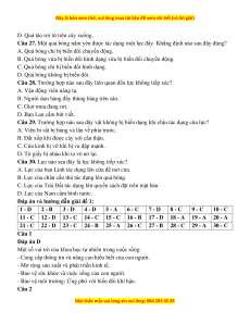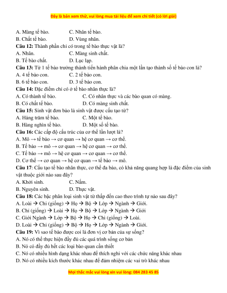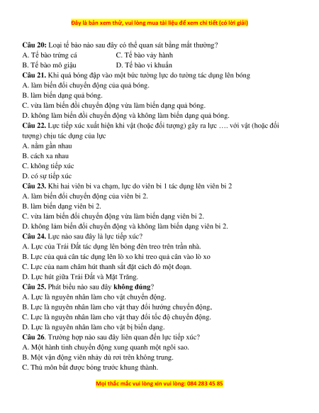 Câu 20: Loại tế bào nào sau đây có thể quan sát bằng mắt thường? A. Tế bào trứng cá C. Tế bào vảy hành B. Tế bào mô giậu D. Tế bào vi khuẩn