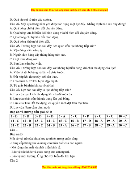 Câu 22. Lực tiếp xúc xuất hiện khi vật (hoặc đối tượng) gây ra lực …. với vật (hoặc đối