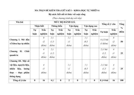 MA TRẬN ĐỀ KIỀM TRA GIỮA KÌ I – KHOA HỌC TỰ NHIÊN 6