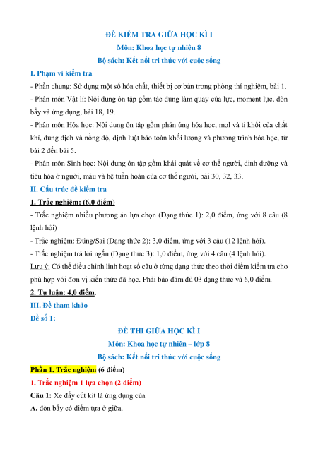 - Tailieugiaovien.com.vn giới thiệu bộ 9 đề thi giữa kì 1 môn Khoa học tự nhiên 8 Kết nối tri thức cấu trúc mới bao gồm: 2 đề form mới nhất song song 3 phân môn năm 2025; 7 đề theo chương trình nối tiếp và song song mới nhất năm 2024 nhằm giúp Giáo viên có thêm tài liệu tham khảo ra đề thi KHTN lớp 8.