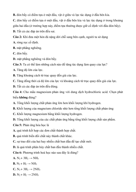 Câu 6: Phương trình hoá học nào sau đây là đúng? A. N2 + 3H2 → NH3 B. N2 + H2 → NH3 C. N2 + 3H2 → 2NH3 D. N2 + H2 → 2NH3