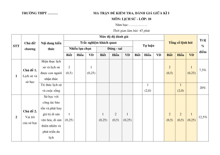 Tổng số lệnh hỏi STT Tự luận % chương thức Nhiều lựa chọn Đúng - sai điểm Biết Hiểu VD Biết Hiểu VD Biết Hiểu VD Biết Hiểu VD Hiện thực lịch sử và lịch sử 2 1 2 1 Chủ đề 1. 7,5% được con người (0,5) (0,25) (0,5) (0,25) 1 Lịch sử và nhận thức sử học Tri thức lịch sử 1 1 20% và cuộc sống (2,0) (2,0) Sử học với công tác bảo tồn và phát huy Chủ đề 2. giá trị di sản 1 1 2 1 2 2 1 2 Vai trò 12,5% văn hóa, di sản (0,25) (0,25) (0,5) (0,25) (0,5) (0,5) (0,25) của sử học thiên nhiên và phát triển du lịch Khái niệm văn minh. Một số Chủ đề 3. nền văn minh 4 2 1 2 1 5 2 3 25% Một số phương Đông (1,0) (0,25) (0,25) (0,5) (0,25) (1,25) (0,5) (0,75) nền văn thời cổ - trung 3 minh thế đại giới cổ - Một số nền văn trung đại minh phương 3 1 1 3 2 20% Tây thời kì cổ (0,75) (0,25) (1,0) (0,75) (1,25) trung đại Các cuộc cách Chủ đề 4. mạng công 2 1 2 1 Các cuộc 7,5% nghiệp thời kì (0,5) (0,25) (0,5) (0,25) cách mạng cận đại 4 công Các cuộc cách nghiệp mạng công 2 1 2 1 trong lịch 7,5% nghiệp thời kì (0,5) (0,25) (0,5) (0,25) sử thế giới hiện đại