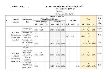 Trắc nghiệm khách quan Tổng STT Tự luận % chương thức Nhiều lựa chọn Đúng - sai điểm Biết Hiểu VD Biết Hiểu VD Biết Hiểu VD Biết Hiểu VD 2 1 1 1 2 3 2 2 Liên hợp quốc 17,5% (0,5) (0,25) (0,25) (0,25) (0,5) (0,75) (0,5) (0,5) Chủ đề 1. Trật tự thế giới 2 1 2 3 2 Thế giới trong trong Chiến 25% 1 (0,5) (0,5) (1,5) (1,0) (1,5) và sau Chiến tranh lạnh tranh lạnh Trật tự thế giới 2 1 1 2 3 1 2 sau Chiến tranh 15% (0,5) (0,25) (0,25) (0,5) (0,75) (0,25) (0,5) lạnh Sự ra đời và phát triển của Hiệp hội các 2 1 1 1 2 3 2 2 Chủ đề 2. 17,5% quốc gia Đông (0,5) (0,25) (0,25) (0,25) (0,5) (0,75) (0,5) (0,5) ASEAN 2 Nam Á những chặng (ASEAN) đường lịch sử Cộng đồng 2 1 1 2 1 3 1 2 ASEAN: từ ý 25% (0,5) (0,25) (0,25) (0,5) (1,0) (0,75) (0,25) (1,5) tưởng đến hiện thực
