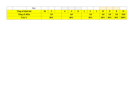 Tổng số lệnh hỏi 10 2 4 4 8 1 2 1 15 8 8 31 Tổng số điểm 3,0 4,0 3,0 4,0 3,0 3,0 10,0 Tỉ lệ % 30% 40% 30% 40% 30% 30% 100%