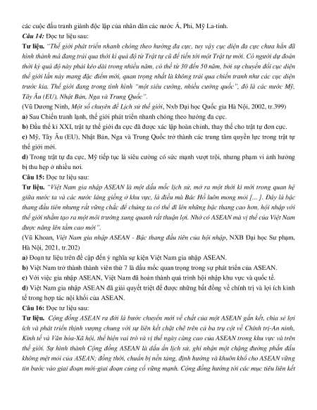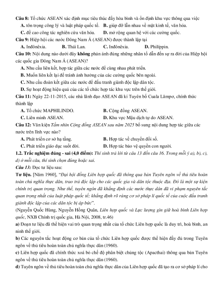 Câu 9: Hiệp hội các nước Đông Nam Á (ASEAN) được thành lập tại A. Inđônêxia. B. Thái Lan. C. Inđônêxia. D. Philíppin.