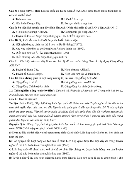 Câu 8: Tháng 8/1967, Hiệp hội các quốc gia Đông Nam Á (ASEAN) được thành lập là biểu hiện rõ nét của xu thế nào? A. Toàn cầu hóa.