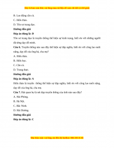Câu 7. Hát quan họ là nét đẹp truyền thống của tỉnh nào sau đây? A. Hải Phòng. B. Hà Nội. C. Bắc Ninh. D. Hải Dương. Hướng dẫn giải Đáp án đúng là: C