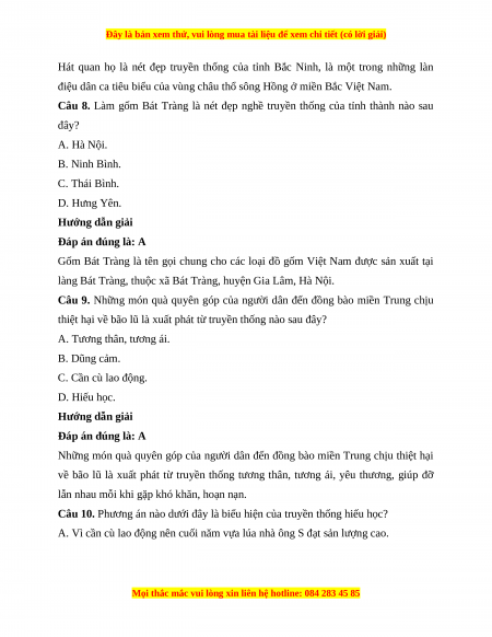 Câu 8. Làm gốm Bát Tràng là nét đẹp nghề truyền thống của tỉnh thành nào sau đây? A. Hà Nội. B. Ninh Bình. C. Thái Bình. D. Hưng Yên. Hướng dẫn giải Đáp án đúng là: A