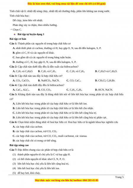 Câu 1: Thành phần các nguyên tố trong hợp chất hữu cơ