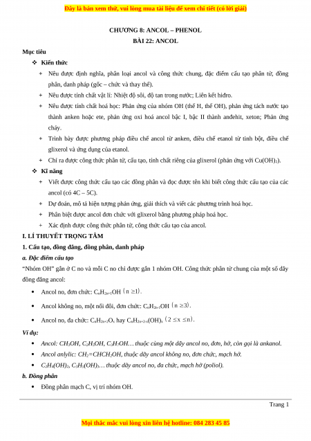 CHƯƠNG 8: ANCOL – PHENOL BÀI 22: ANCOL Mục tiêu Kiến thức