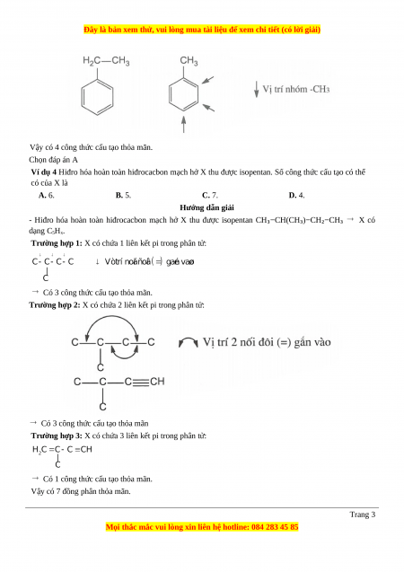 Ví dụ 4 Hiđro hóa hoàn toàn hiđrocacbon mạch hở X thu được isopentan. Số công thức cấu tạo có thể có của X là A. 6. B. 5. C. 7. D. 4. Hướng dẫn giải