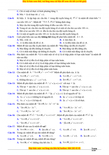 Câu 11: Phủ định của mệnh đề: “Có ít nhất một số vô tỷ là số thập phân vô hạn tuần hoàn” là mệnh đề nào sau đây:
