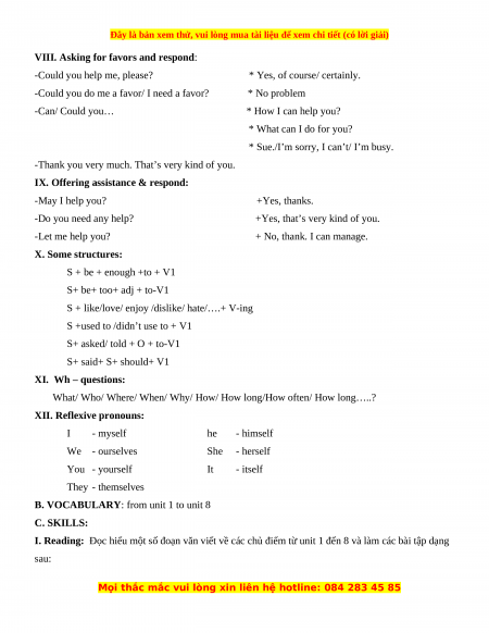 B. VOCABULARY: from unit 1 to unit 8 C. SKILLS: