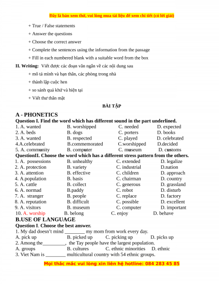 I. Reading: Đọc hiểu một số đoạn văn viết về các chủ điểm từ unit 1 đến 8 và làm các bài tập dạng sau: