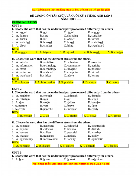 ĐỀ CƯƠNG ÔN TẬP GIỮA VÀ CUỐI KỲ 1 TIẾNG ANH LỚP 8 NĂM HỌC: ….. PRONUNCIATION UNIT 1: