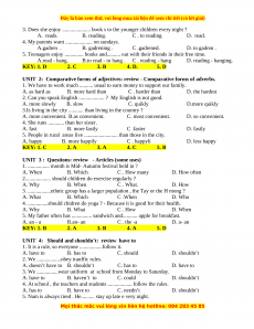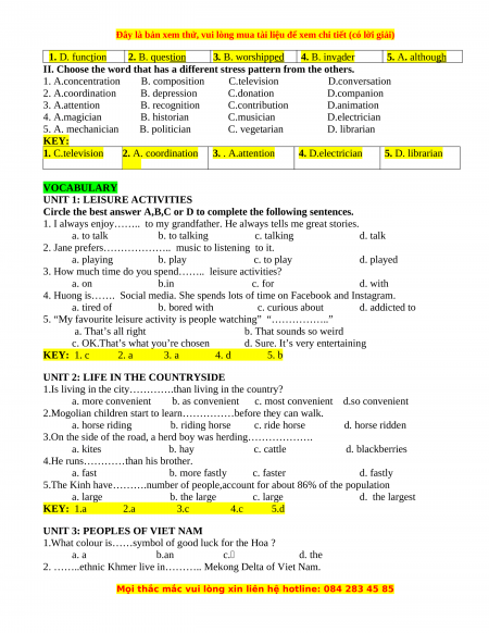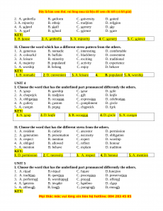 II. Choose the word that has the different stress from the others. 1. A. nomadic B. generous C. colourful D. countryside 2. A. popular B. calculus C. beehive D. disturb 3. A. harvest B. collect C. peaceful D. worship 4. A. charade B. transport C. melody D. paddy 5. A. opportunity B. inconvenient C. facility D. optimistic KEY: 1. A. nomadic 2. D. disturb 3. B. collect 4. A. charade 5. C. facility UNIT 3: