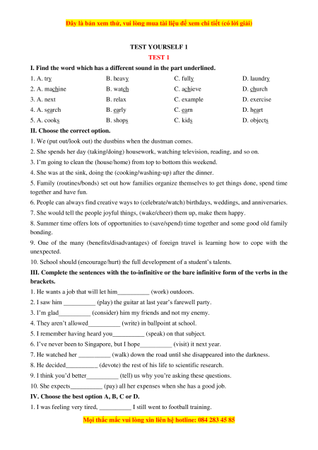 I. Find the word which has a different sound in the part underlined. 1. A. try B. heavy C. fully D. laundry 2. A. machine B. watch C. achieve D. church 3. A. next B. relax C. example D. exercise 4. A. search B. early C. earn D. heart 5. A. cooks B. shops C. kids D. objects