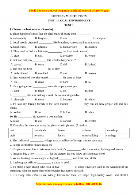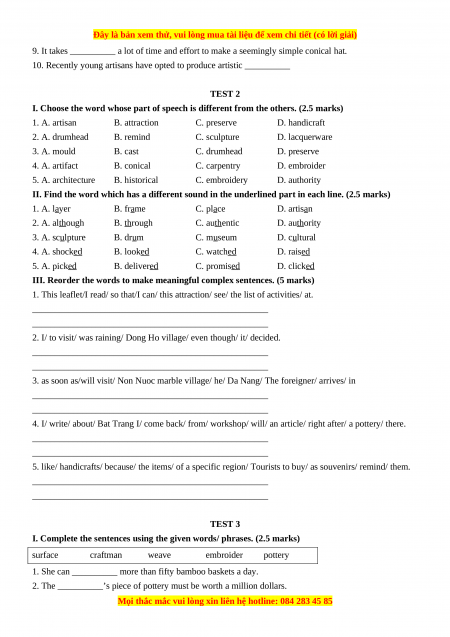 I. Choose the word whose part of speech is different from the others. (2.5 marks) 1. A. artisan B. attraction C. preserve D. handicraft 2. A. drumhead B. remind C. sculpture D. lacquerware 3. A. mould B. cast C. drumhead D. preserve 4. A. artifact B. conical C. carpentry D. embroider 5. A. architecture B. historical C. embroidery D. authority