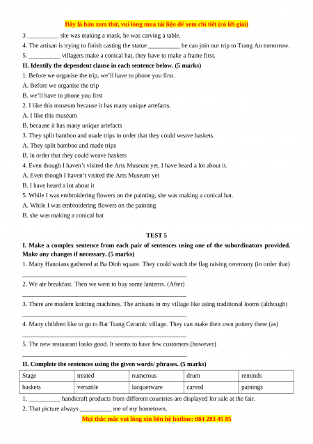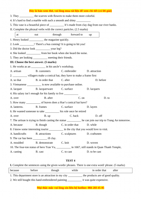 7. The artisan is trying to finish casting the statue __________ he can join our trip to Trang An tomorrow. A. because B. though C. in order that D. while