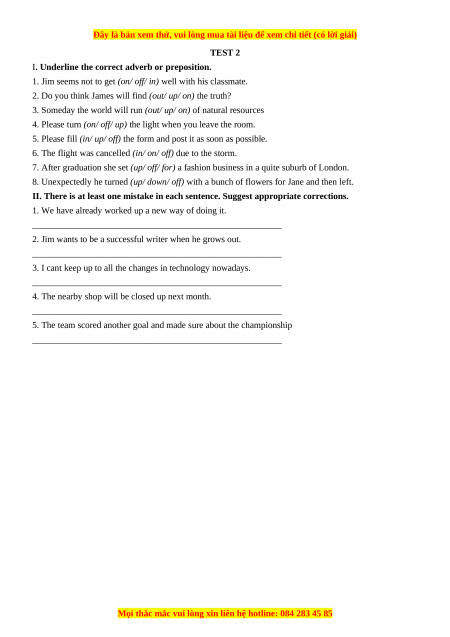 5. They were reading while their mother was watching TV. TEST 2 I. 1. on 2. out 3. Out 4. Off 5. in 6. off 7. up 8. Up II.