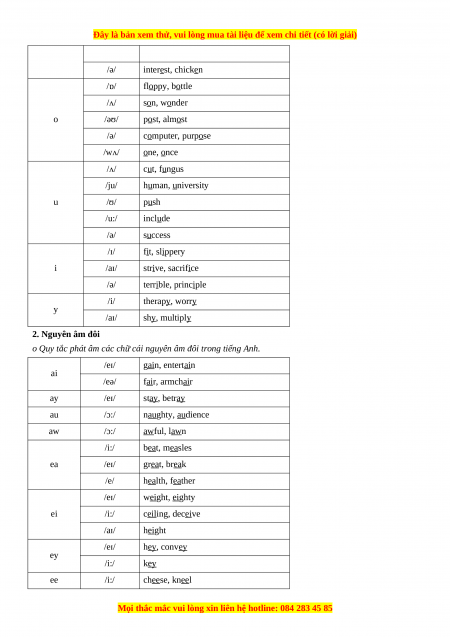 /ə/ interest, chicken /ɒ/ floppy, bottle /ʌ/ son, wonder o /əʊ/ post, almost /ə/ computer, purpose /wʌ/ one, once /ʌ/ cut, fungus /ju/ human, university u /ʊ/ push /u:/ include /ə/ success /ɪ/ fit, slippery i /aɪ/ strive, sacrifice /ə/ terrible, principle /i/ therapy, worry y /aɪ/ shy, multiply 2. Nguyên âm đôi