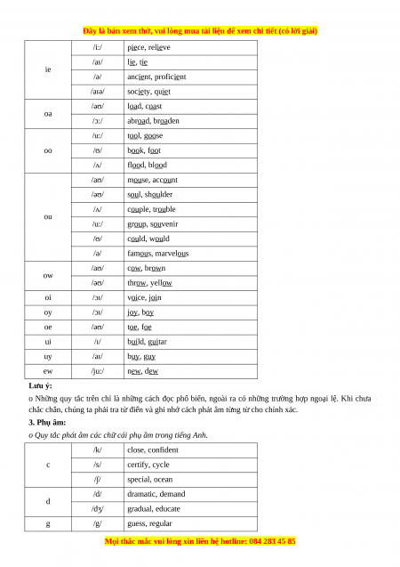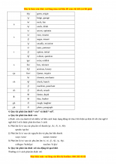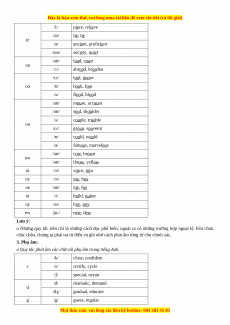 /i:/ piece, relieve /aɪ/ lie, tie ie /ə/ ancient, proficient /aɪə/ society, quiet /əʊ/ load, coast oa /ɔ:/ abroad, broaden /u:/ tool, goose oo /ʊ/ book, foot /ʌ/ flood, blood /aʊ/ mouse, account /əʊ/ soul, shoulder /ʌ/ couple, trouble ou /u:/ group, souvenir /ʊ/ could, would /ə/ famous, marvelous /aʊ/ cow, brown ow /əʊ/ throw, yellow oi /ɔɪ/ voice, join oy /ɔɪ/ joy, boy oe /əʊ/ toe, foe ui /ɪ/ build, guitar uy /aɪ/ buy, guy ew /ju:/ new, dew Lưu ý: