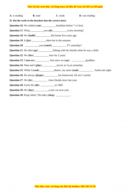 Question 5. Tim___________a book when I came to his house. A. is reading B. read C. was reading D. reading