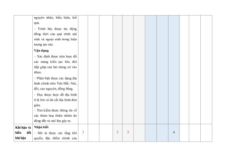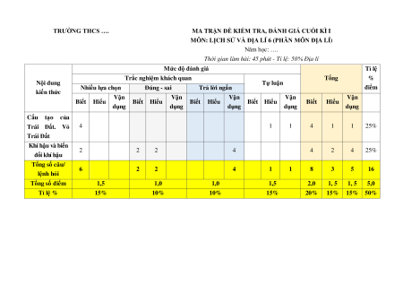Trắc nghiệm khách quan Tổng % Nội dung Tự luận Nhiều lựa chọn Đúng - sai Trả lời ngắn điểm kiến thức Vận Vận Vận Vận Vận Biết Hiểu Biết Hiểu Biết Hiểu Biết Hiểu Biết Hiểu dụng dụng dụng dụng dụng Cấu tạo của Trái Đất. Vỏ 4 1 1 4 1 1 25% Trái Đất Khí hậu và biến 2 2 2 4 4 2 4 25% đổi khí hậu Tổng số câu/ 6 2 2 4 1 1 8 3 5 16 lệnh hỏi Tổng số điểm 1,5 1,0 1,0 1,5 2,0 1, 5 1, 5 5,0 Tỉ lệ % 15% 10% 10% 15% 20% 15% 15% 50% TRƯỜNG THCS ....