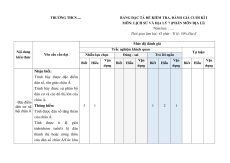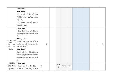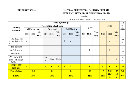 Trắc nghiệm khách quan Tổng % Nội dung Tự luận Nhiều lựa chọn Đúng - sai Trả lời ngắn điểm kiến thức Vận Vận Vận Vận Vận Biết Hiểu Biết Hiểu Biết Hiểu Biết Hiểu Biết Hiểu dụng dụng dụng dụng dụng - Đặc điểm dân 20,0 cư xã hội châu 3 1 1 2 1 4 3 1 % Á - Bản đồ chính 17,5 trị các khu vực 1 1 1 2 1 0% của châu Á - Vị trí địa lí đặc 1lện 12,5 điểm tự nhiên 1 1lệnh 2lệnh 2 1 2 h % châu Phi Tổng số câu/ 4 2 1 1 2 1 2 1 1 1 6 6 4 16 lệnh hỏi Tổng số điểm 1,5 1,0 1,0 1,5 1,5 2,25 1,25 5,0 22,5 12,5 Tỉ lệ % 15% 10% 10% 15% 15% 50% % % TRƯỜNG THCS ....