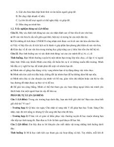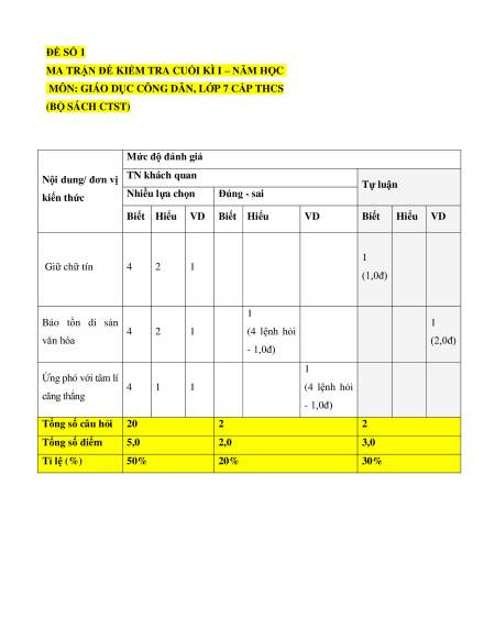 Nội dung/ đơn vị TN khách quan Tự luận kiến thức Nhiều lựa chọn Đúng - sai Biết Hiểu VD Biết Hiểu VD Biết Hiểu VD 1 Giữ chữ tín 4 2 1 (1,0đ) 1 Bảo tồn di sản 1 4 2 1 (4 lệnh hỏi văn hóa (2,0đ) - 1,0đ) 1 Ứng phó với tâm lí 4 1 1 (4 lệnh hỏi căng thẳng - 1,0đ) Tổng số câu hỏi 20 2 2 Tổng số điểm 5,0 2,0 3,0 Tỉ lệ (%) 50% 20% 30%