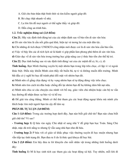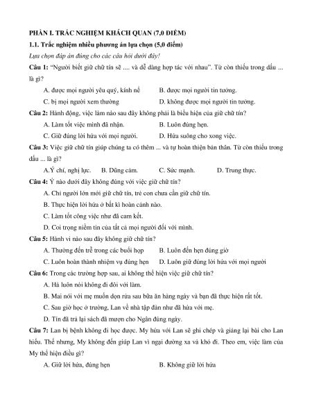 Câu 3: Việc giữ chữ tín giúp chúng ta có thêm ... và tự hoàn thiện bản thân. Từ còn thiếu trong dấu ... là gì? A.Ý chí, nghị lực. B. Dũng cảm. C. Sức mạnh. D. Trung thực.