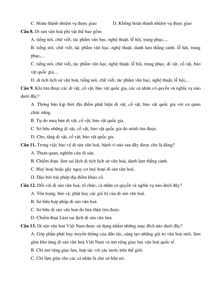 Câu 12. Đối với di sản văn hoá, tổ chức, cá nhân có quyền và nghĩa vụ nào dưới đây?