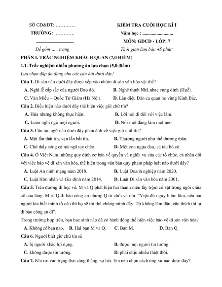 Bộ đề thi cuối kì 1 GDCD 7 Kết nối tri thức Cấu trúc mới có đáp án