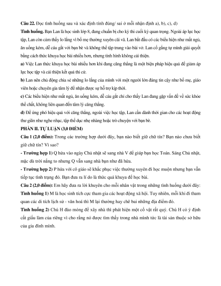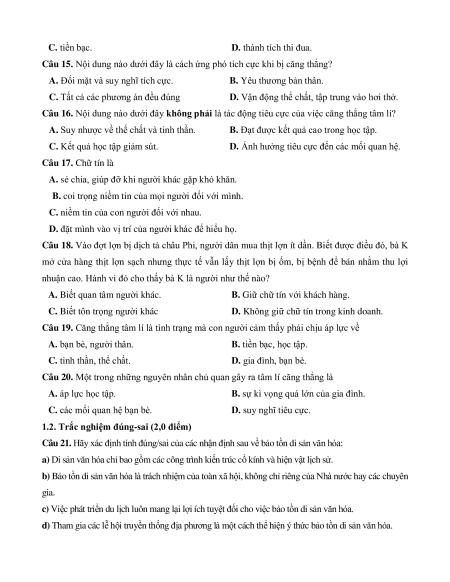 Câu 19. Căng thẳng tâm lí là tình trạng mà con người cảm thấy phải chịu áp lực về
