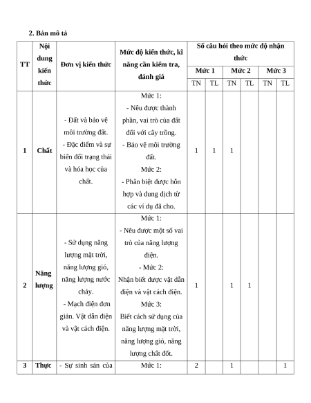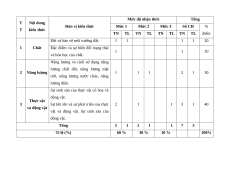 năng cần kiểm tra, kiến Mức 1 Mức 2 Mức 3 đánh giá thức TN TL TN TL TN TL Mức 1: - Nêu được thành - Đất và bảo vệ phần, vai trò của đất môi trường đất. đối với cây trồng. - Đặc điểm và sự - Bảo vệ môi trường 1 Chất 1 1 1 biến đổi trạng thái đất. và hóa học của Mức 2: chất. - Phân biệt được hỗn hợp và dung dịch từ các ví dụ đã cho. Mức 1: