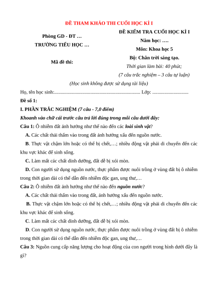 - Tailieugiaovien.com.vn giới thiệu bộ 2 đề Cuối kì 1 gồm đầy đủ ma trận và lời giải chi tiết môn Khoa học lớp 5 Chân trời sáng tạo mới nhất năm 2024 nhằm giúp Giáo viên có thêm tài liệu tham khảo ra đề thi Khoa học lớp 5.