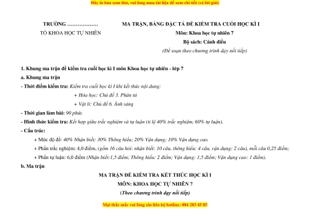 1. Khung ma trận đề kiểm tra cuối học kì I môn Khoa học tự nhiên - lớp 7 a. Khung ma trận