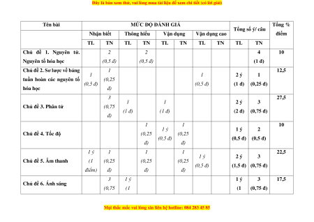 MỨC ĐỘ ĐÁNH GIÁ Tổng % Tổng số ý/ câu Nhận biết Thông hiểu Vận dụng Vận dụng cao điểm TL TN TL TN TL TN TL TN TL TN