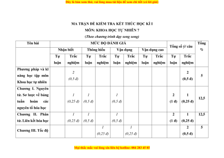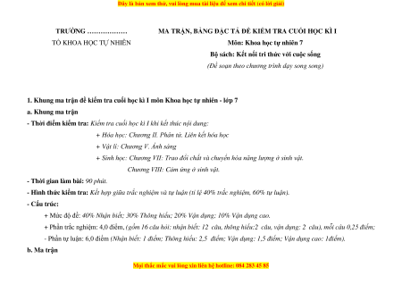 1. Khung ma trận đề kiểm tra cuối học kì I môn Khoa học tự nhiên - lớp 7 a. Khung ma trận