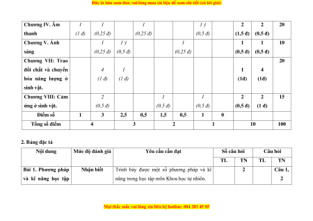 hóa năng lượng ở (1 đ) (1 đ) (1đ) (1đ) sinh vật. Chương VIII: Cảm 2 1 1 2 2 15 ứng ở sinh vật. (0,5 đ) (0,5 đ) (0,5 đ) (0,5 đ) (1 đ) Điểm số 1 3 2,5 0,5 1,5 0,5 1 0 Tổng số điểm 4 3 2 1 10 100 2. Bảng đặc tả Nội dung