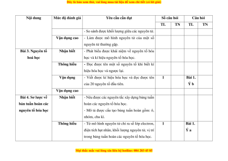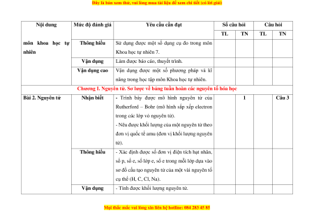 MỨC ĐỘ ĐÁNH GIÁ Tổng Tổng số ý/ câu Nhận biết Thông hiểu Vận dụng Vận dụng cao % Tự Trắc Tự Trắc Tự Trắc Tự Trắc Tự Trắc luận nghiệm luận nghiệm luận nghiệm luận nghiệm luận nghiệm Phương pháp và kĩ 2 2 năng học tập môn 5 (0,5 đ) (0,5 đ) Khoa học tự nhiên Chương I. Nguyên